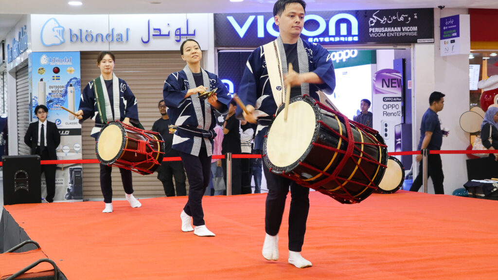 With the rhythmic pounding of drum beats reverberating through the shopping centre, it’s easy to imagine being smack in the middle of an ancient Japanese ritual of performance. A quick look around reminds us that we are in fact, in the middle of Times Square shopping centre, in Berakas, and the drumming is courtesy of Marunone, a Japanese drum performing group utilizing traditional ‘wadaiko’ and setting a truly festive atmosphere at the venue.