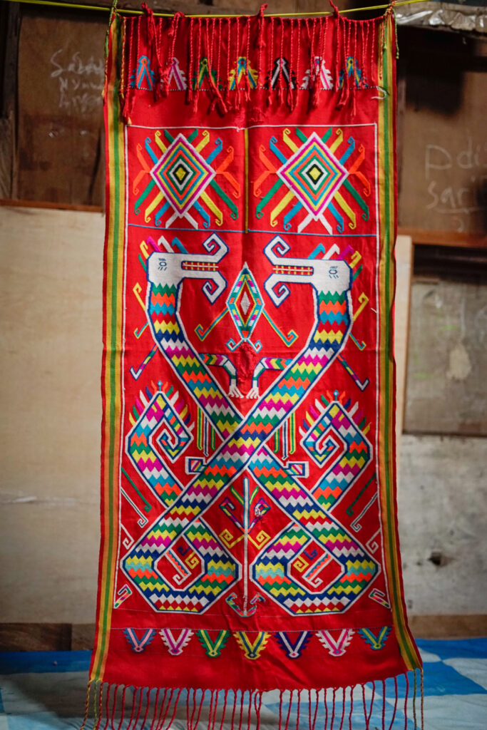 “My personal interest was to dig into the wisdom about stories behind the Nabau pattern,” explained Hardiyanti. The pair made often long and difficult journeys to personally meet and interview the remaining master weavers living in remote kampongs, collecting stories and data that could give them a greater insight into the legend and use of the Nabau icon in tribal culture while connecting it with local context on weaving and global issues like climate change and biodiversity threats. The image of Nabau frequently appears in various forms of visual art and handicrafts, according to their paper, most commonly in tattoos, woven bemban mats, textiles, and wood carvings. “When a weaver depicts the Nabau in their weavings or mats, they must always create pairs — an even number of serpents. If only one is illustrated, it is believed that the spirit within the design will haunt the weaver,” it is noted. A villager from Dusun Lauk Rugun is said to have recounted that Nabau’s spirit appeared in the dream of a weaver, claiming her as his bride and threatening to take her soul into the realm of Nabau — the spirit world.